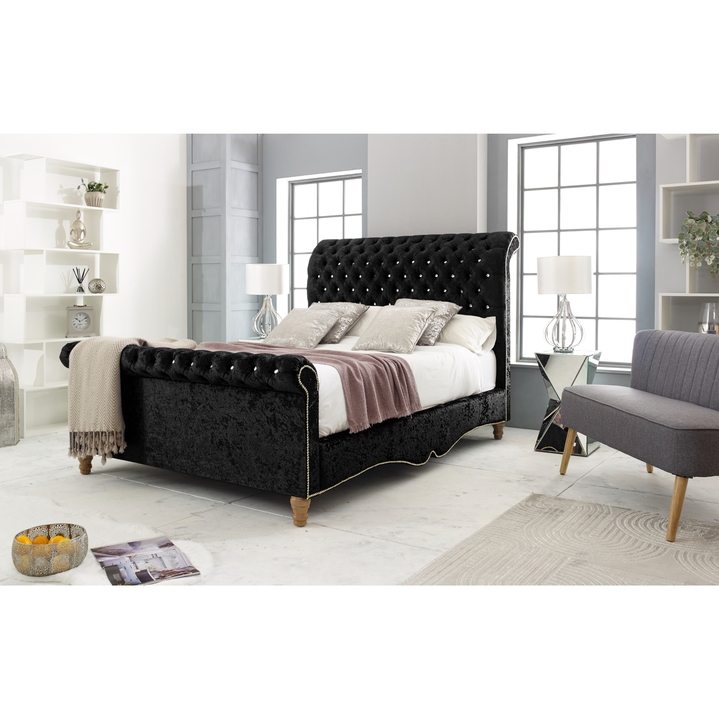 Our Epsol bed frame brings class and style to your bedroom! Featuring a crystal-studded design deeply burrowed into the velvet covering of the headboard in tiny details with stylish gold beading at the edges, the Epsol bed frame stands out in your sleeping space elegantly. The sleigh design will transform any bedroom and make it the center of attraction. The upholstered headboard makes for the perfect place to relax in the morning or evening and enjoy a cup of coffee as you watch the morning news or read your favorite book. Epsol is available in different colors and you are sure to find the perfect combinations that you would love.