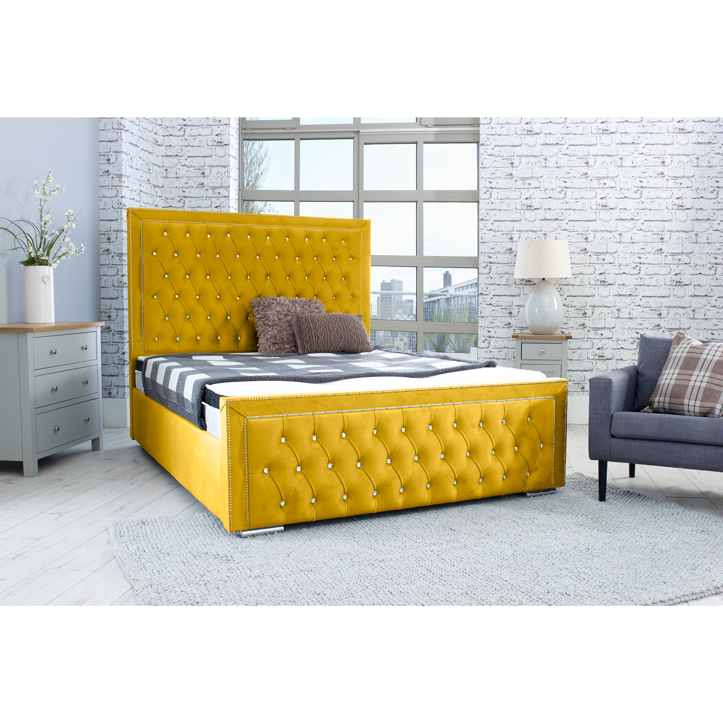 If you are all for glamour embedded in comfort, the Hendrick bed is will certainly add a touch of opulence and elegance to your bedroom. Featuring a trendy design and elegant, tall headboard stylishly upholstered in contemporary Spanish upholstery, the plush velvety fabric covering is perfection at its best. The headboard and footboard feature a classic tufted buttoning design that comes in crystal. The edges are exquisitely sewn in with delightful tiny pearls to give a magnificent look. The finishing is perfect and speaks of glamour and impeccable style. The chrome feet, 4-inch solid thick frame, and solid board base ensure that the bed has the stability and durability you desire. Choose from a variety of plush velvety fabrics for the covering. All accessories, including the mattress, are not included in the package.