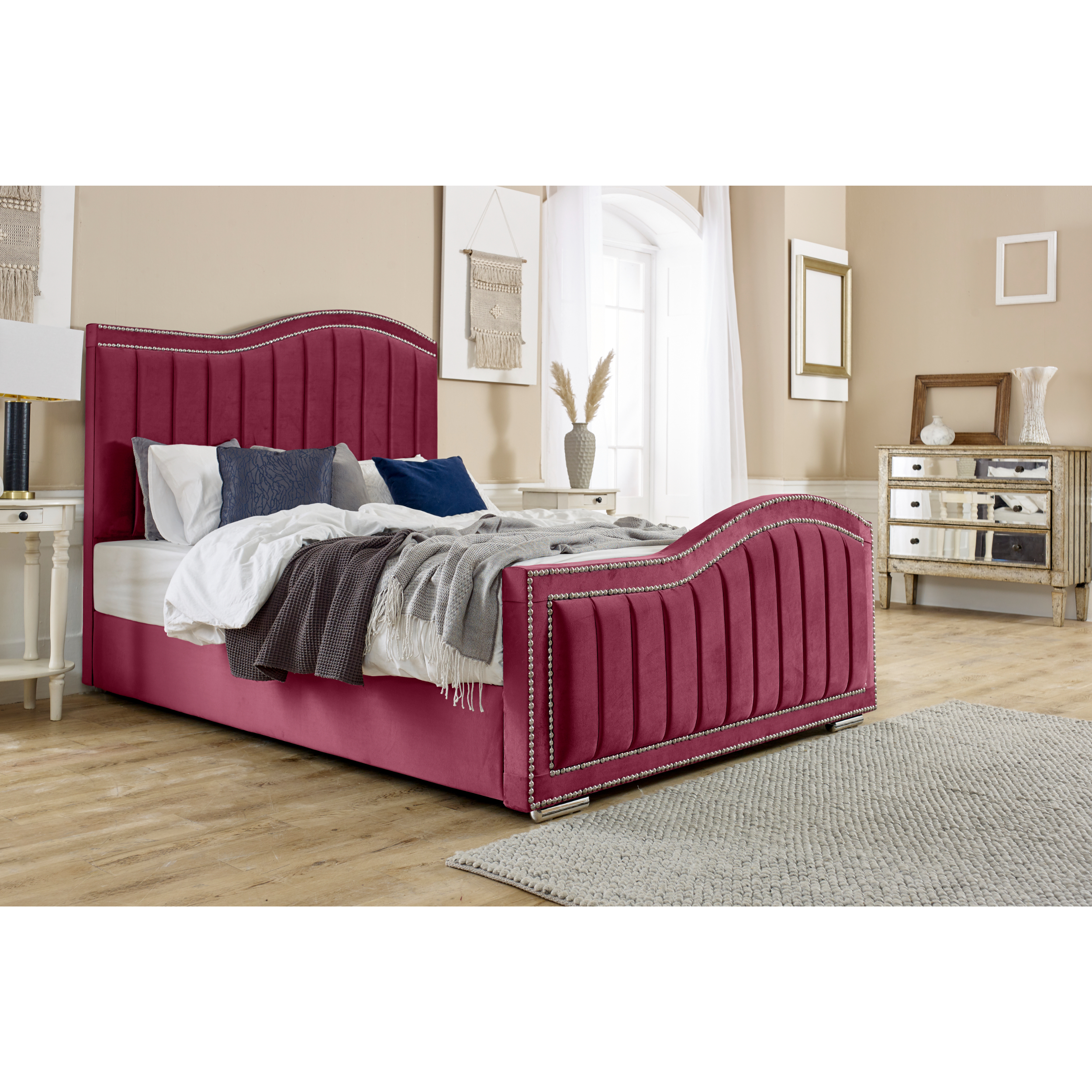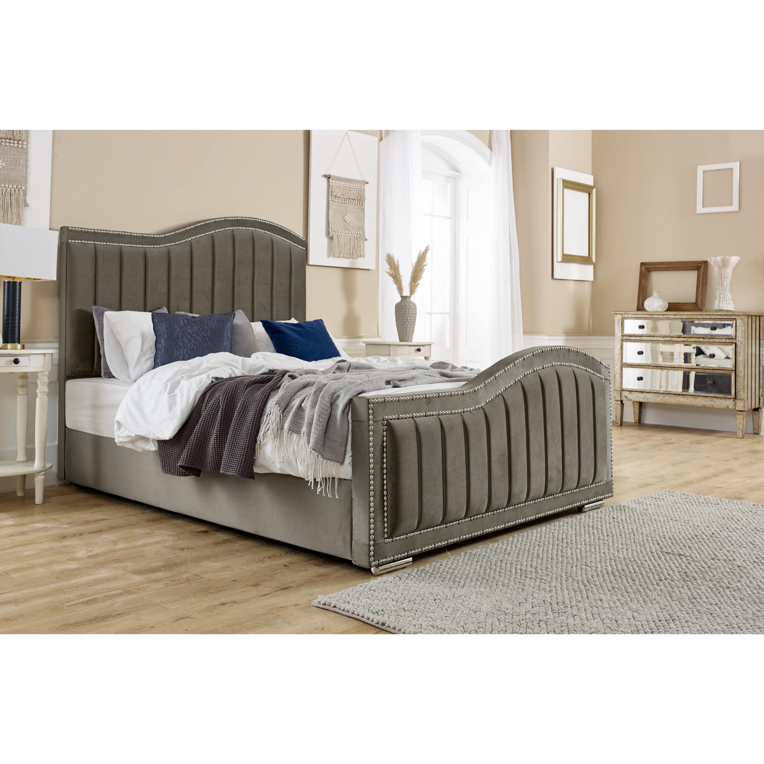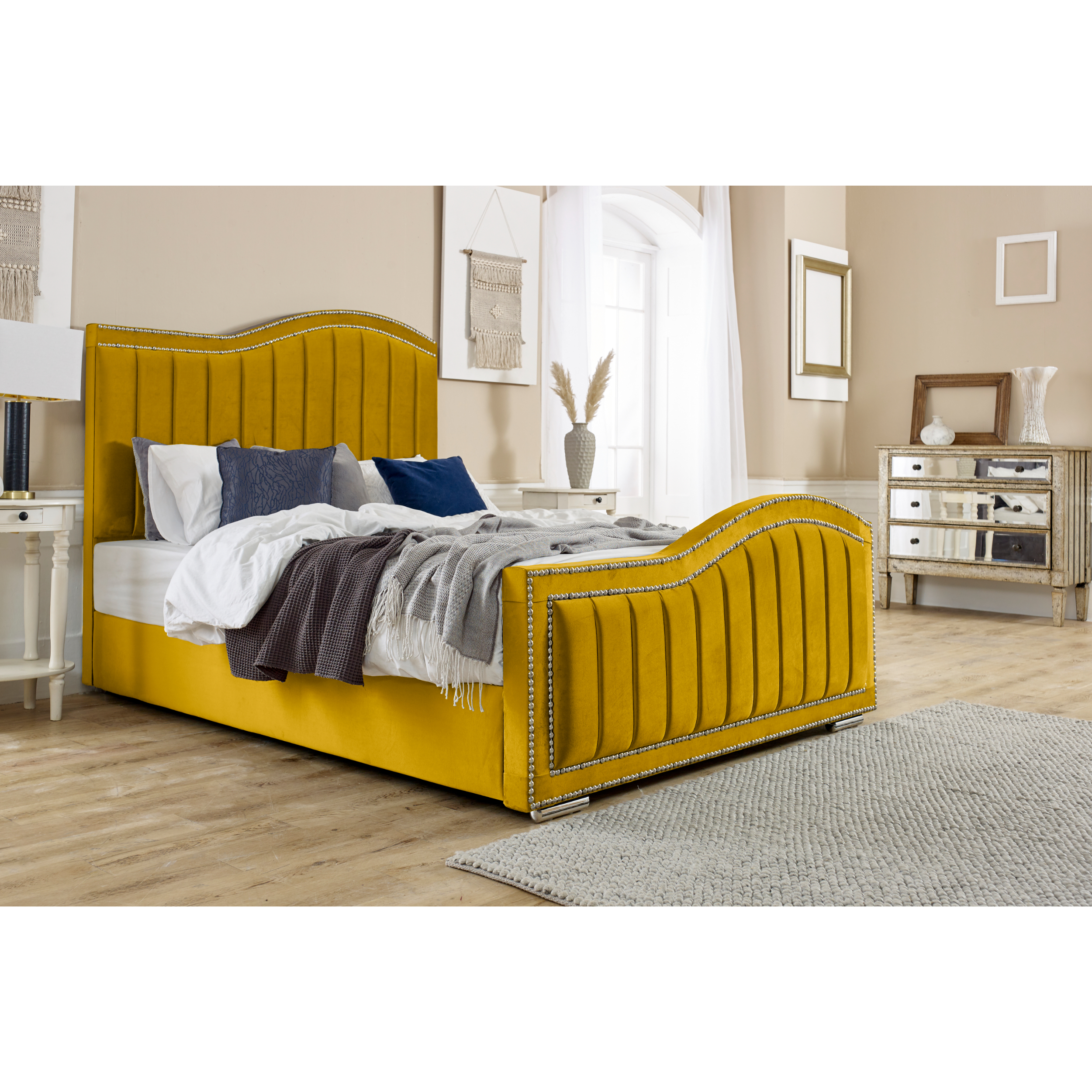 The elegant and luxurious Kendrick bed incorporates a stylish curved wing headboard and footboard. It reflects a distinctive appearance in any bedroom style, whether traditional or contemporary. The headboard and footboard are intricately beaded in a lined design covered with plush velvet material. Its 4-inch solid thick frame, sturdy board base, and chrome feet all make up the ingredient that makes the bed frame a strong, durable piece with exceptional stability. Kendrick is available in a wide range of luxurious plush velvet colours. The mattress is not included in the package.