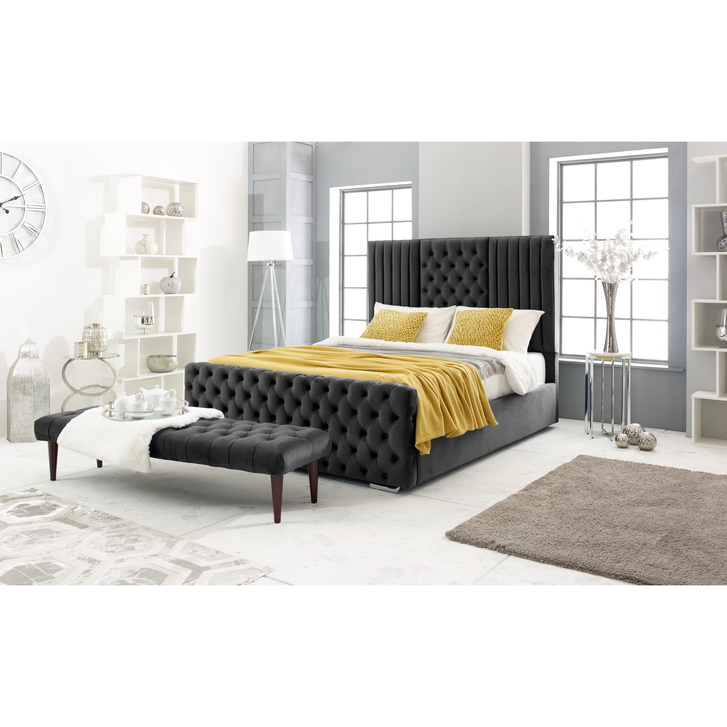Beautifully designed, the Lorina bed frame is every shade of opulence and sophistication. When you want something unique to transform your sleeping space into an exquisite haven, the Lorina bed frame is what you need. It features a unique headboard with a brick design bridged by a deeply buttoned tufting design that gives a dramatic contrast. The footboard also features a similar tuft design with plain velvety sideboards, giving the whole bed frame a perfect finish. Lorina will undoubtedly add a touch of glamour to your bedroom. For stability, it features a 4-inch solid thick frame, stylish chrome feet, and a solid board base. Lorina comes in a variety of colors that you can explore.